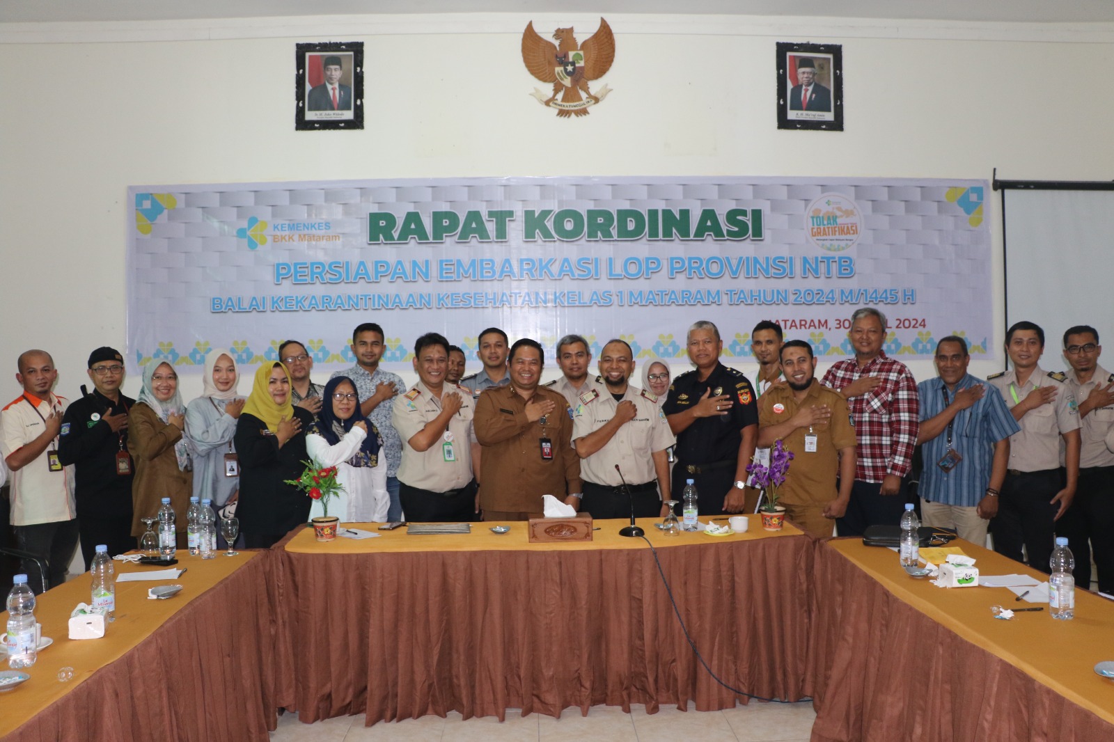 Balai Kekarantinaan Kesehatan Kelas I Mataram menyelenggarakan Rapat Koordinasi Persiapan Embarkasi LOP Provinsi NTB bertujuan untuk mematangkan persiapan pelayanan Embarkasi LOP 1445 H untuk masing-masing bidang pelayanan serta mengevaluasi kembali tentang Embarkasi LOP 1444 H sebagai bahan perbaikan pelayanan tahun ini.