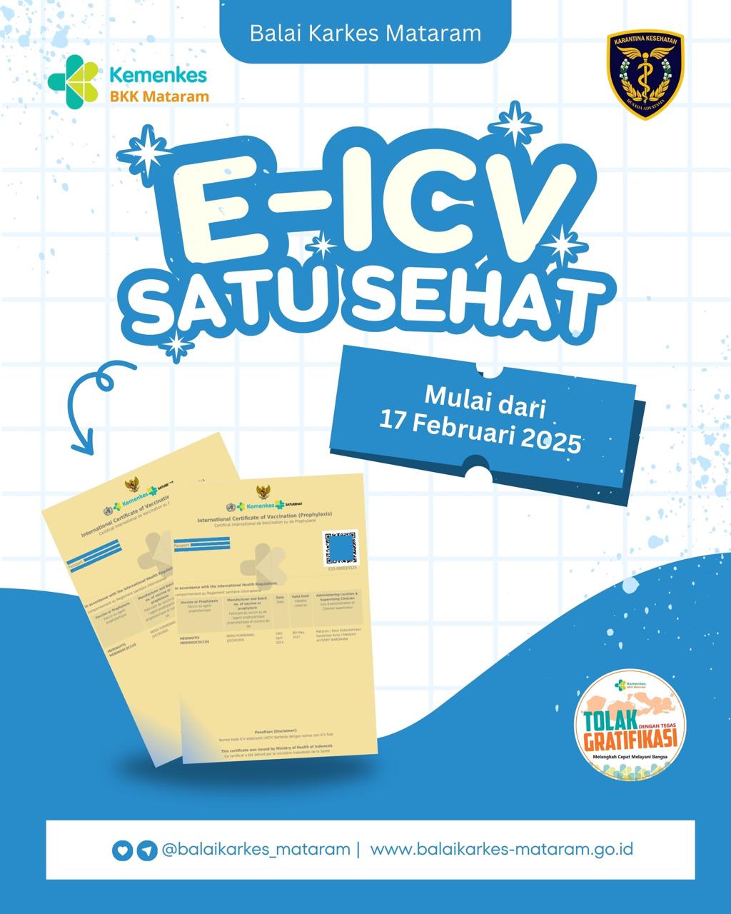 Mulai hari ini Balai Karkes Mataram sudah menggunakan e-ICV dan Penerapan e-ICV ini akan dilakukan oleh seluruh faskes binaan, pemberlakuan e-ICV bagi seluruh pengguna jasa atau pelaku perjalanan yang akan mendapatkan layanan Vaksinasi Internasional wajib mengunduh Aplikasi Satu Sehat Mobile   ( 17-02-2025 )