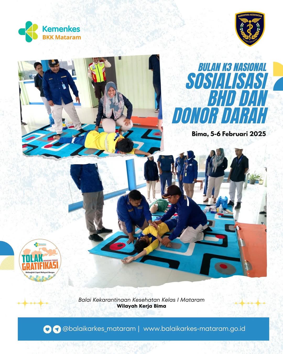 Dalam rangka memperingati Bulan Keselamatan dan Kesehatan Kerja Nasional , PT. Pelindo III Cabang Bima bekerja sama dengan Balai Kekarantinaan Kesehatan Kelas I Mataram Wilayah Kerja Bima mengadakan acara Donor Darah serta Sosialisasi Bantuan Hidup Dasar ( BHD ) dan Pertolongan Pertama pada Kecelakaan ( P3K ) pada tanggal 5-6 Februari 2025 di Aula Kantor Pelindo.